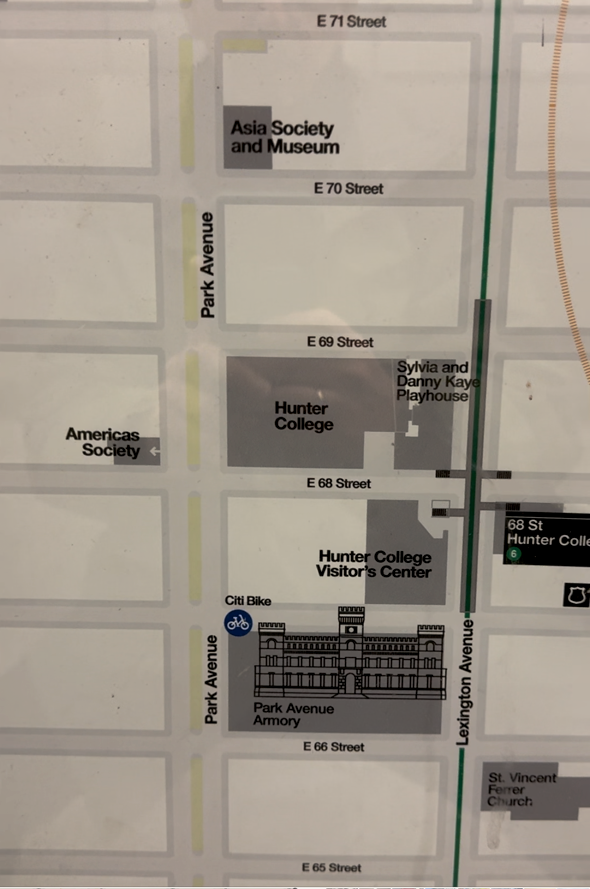 You also can take the F train to the East 63rd Street and Lexington Avenue stop. After exiting the station, walk north on Lexington Avenue to East 69th Street. The college is located at the intersection of East 68th Street and Lexington Avenue. The easiest entrance to music department facilities in Hunter North is from 69 th Street, between Lexington and Park Avenues.